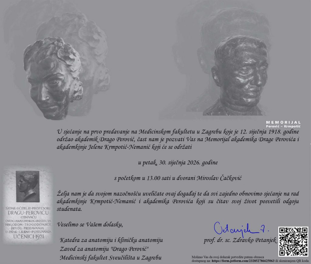 U povodu sjećanja na prvo predavanje na Medicinskom fakultetu Sveučilišta u Zagrebu, koje je 12. siječnja 1918. godine održao akademik Drago Perović, Katedra za anatomiju i kliničku anatomiju organizira Memorijal akademika Drage Perovića i akademkinje Jelene Krmpotić-Nemanić.